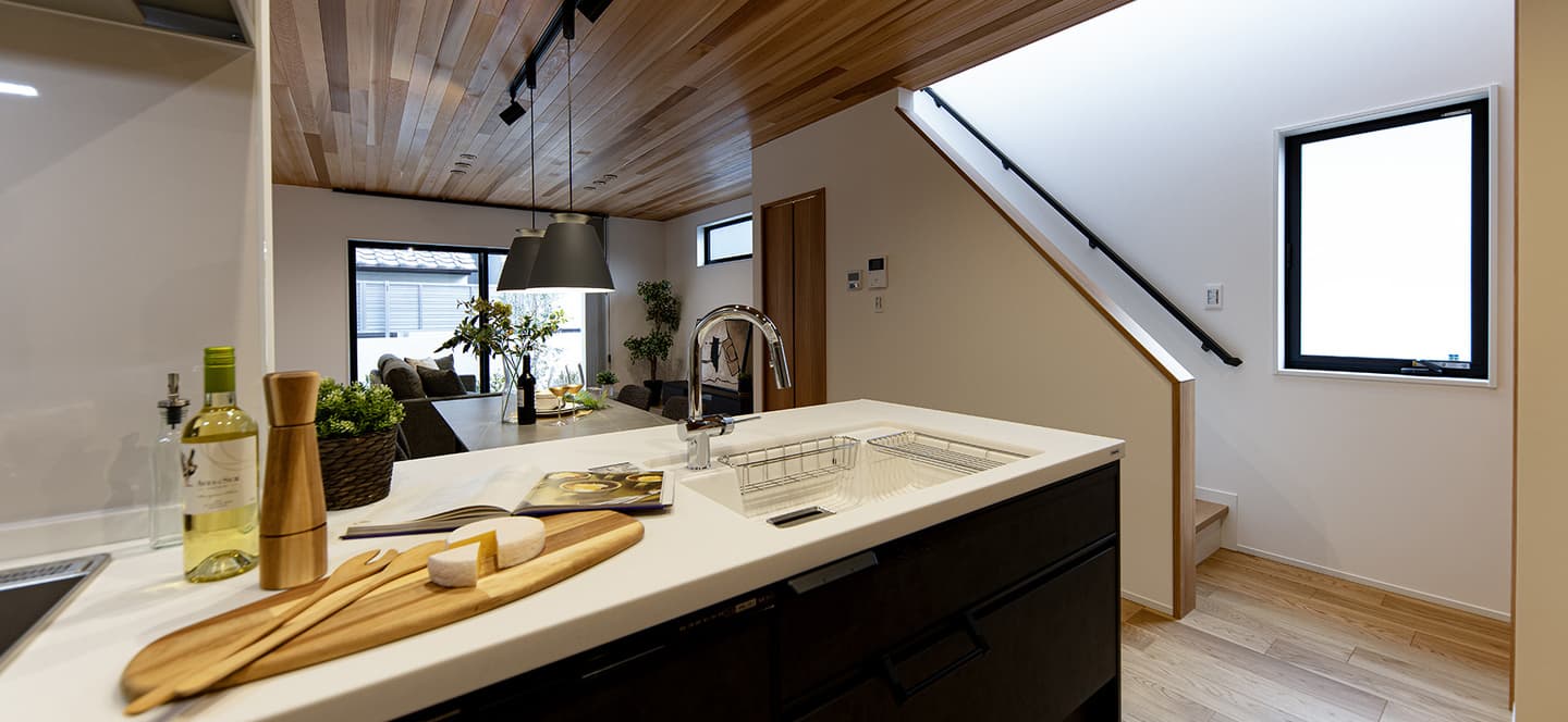 清潔感溢れる広々とした素敵なキッチンスペースは、「機能性」と「開放感」で、楽しい時間をもっと沢山。家族の顔を見ながら、大切な友人との会話を楽しみながら、食事の時間を愉しむ幸福。この家でならもっと大事な時間が積み重ねられる。