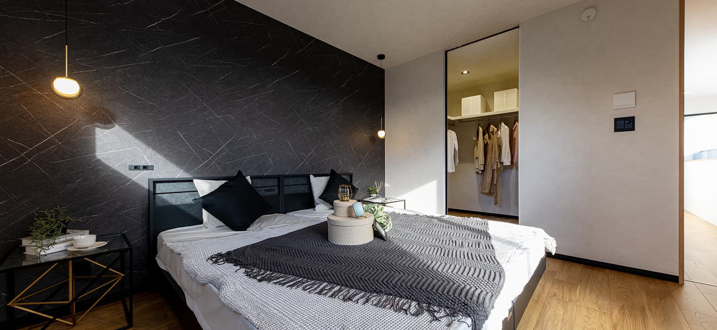 一日の終わりと始まりを味わうベッドルーム。沢山の光と空気を採り込んだ主寝室に、大事な物を沢山収納出来るW.I.Cなど、心地いい暮らしを叶えます。